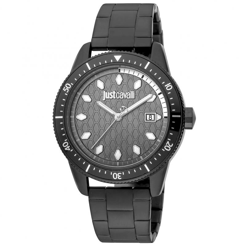 WATCH JUST CAVALLI MAN JC1G179M0085 (42MM). Type of mechanism: QUARTZ. Display: ANALOGICAL. Material of case: STAINLESS STEEL. Colour of case: BLACK. Material of bracelet: STAINLESS STEEL. Colour of bracelet: BLACK. Dial Colour: GREY. Glass type: MINERAL. Clousure: BUTTERFLY. Diameter of dial: 42MM. Submersible: NO