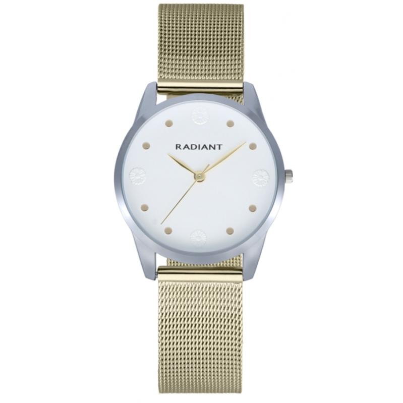 WATCH RADIANT WOMEN RA593202 (36MM). Type of mechanism: QUARTZ. Display: ANALOGICAL. Material of case: METAL. Colour of case: GREY. Material of bracelet: STEEL. Colour of bracelet: GOLDEN. Dial Colour: WHITE. Glass type: MINERAL. Clousure: PRESSURE. Diameter of dial: 36MM. Submersible: NO